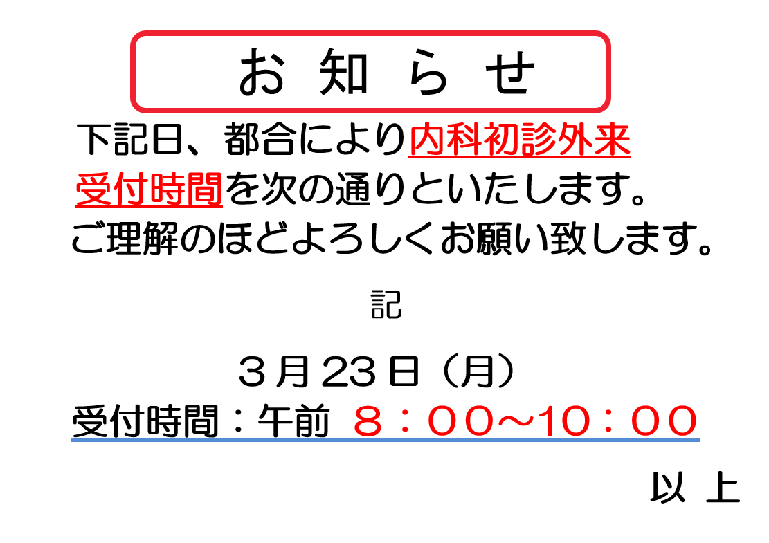 内科初診外来受付時間変更のお知らせ(3月23日)