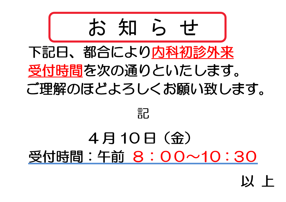 内科初診外来受付時間変更についてお知らせ(4月10日)